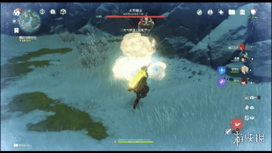 在把场地上的野猪都打倒后大雪猪王会出现并触发战斗,这场战斗格外需要注意的是避开雪猪王的正面以及战斗的持续时间,雪猪王的大部分攻击都是对前方发动,如果处于侧面以及后面就很少会被击中。这个位置缺少火源,无法及时削减寒冷条,寒冷积蓄满后会持续造成伤害,建议带上可以回复生命的角色。